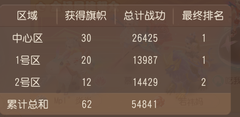 2、成员战功计入所在区域,每区根据战功排名决定旗帜拥有数,区域战功越多,旗子越多。