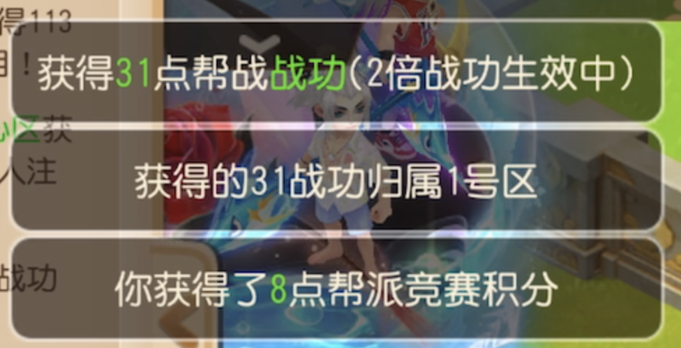 解析:帮战中帮派A有队伍在2号区获胜获得战功,所获战功计入2号区域,队伍在中心区域获胜,战功计入中心区域。简而言之,在哪个区域获得战功就计入哪个区域。