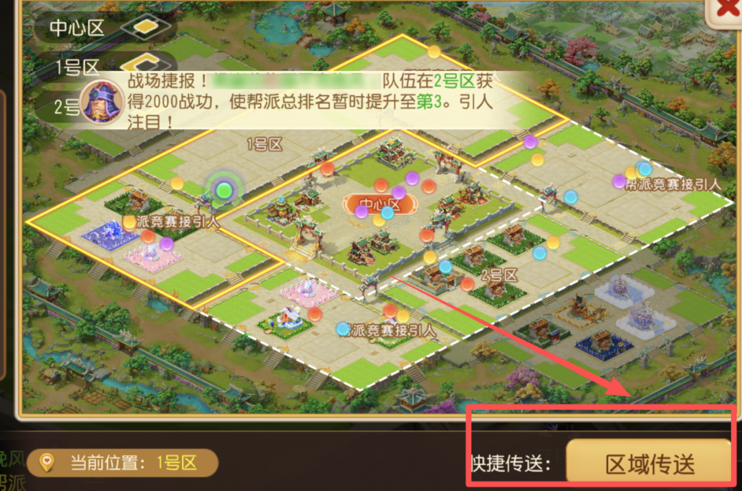 1、在非战斗期间,在小地图中可以看到自己帮派可传送的区域,选中该区域位置,即可进行传送;