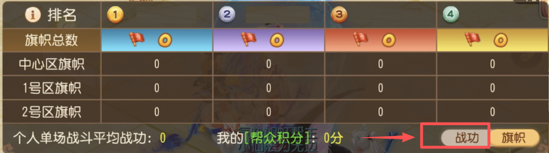 2、各区域中,根据区域总战功对帮战进行排序,排名1-4名分别可获得在该区域20/12/6/2面旗帜。