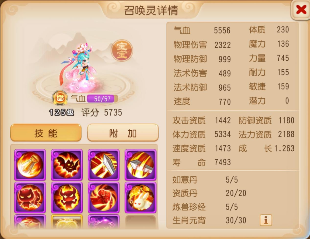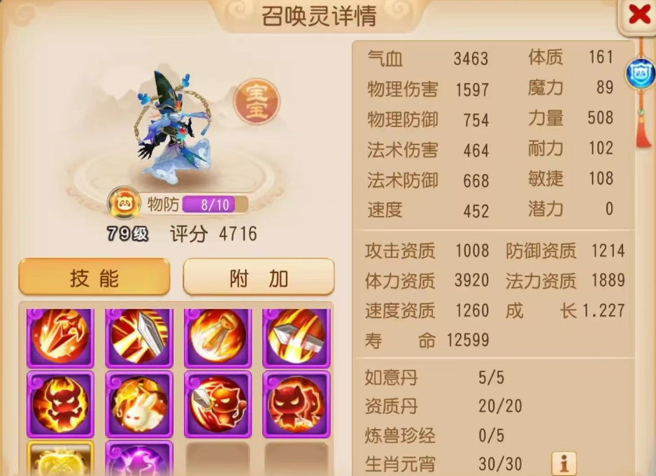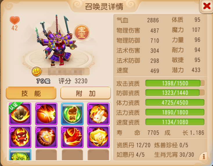这只地狱战神的资质称得上是优秀,携带特殊技能“法术防御”及配速召唤灵不可或缺的高级神佑复生、高级强壮、高级敏捷;高级防御、高级幸运负责增加其生存能力;冥思和再生可谓是回复好搭档,一个回血一个回蓝,非常适配配速召唤灵。专属套装受到拥有神佑复生类技能的单位攻击时,减免20%的法术伤害结果。再加上法术防御技能减免50%的法术伤害结果,不仅十分有个性,更是“水火不侵”!