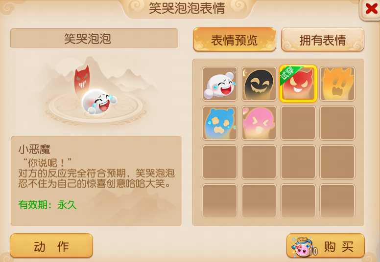 笑哭泡泡拥有5种不同的替换背后灵表情装饰:小得意、小恶魔、小惊吓、小感动、小幸福,使用神兜兜即可解锁笑哭泡泡不同的表情。一宠千面,由你而定。