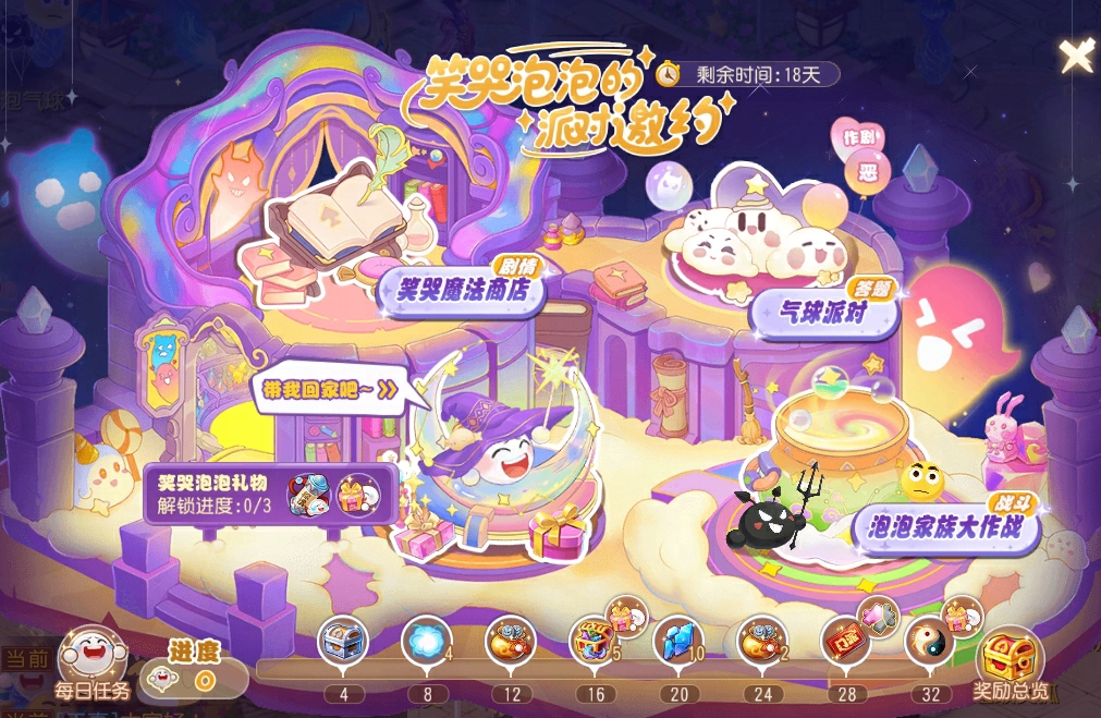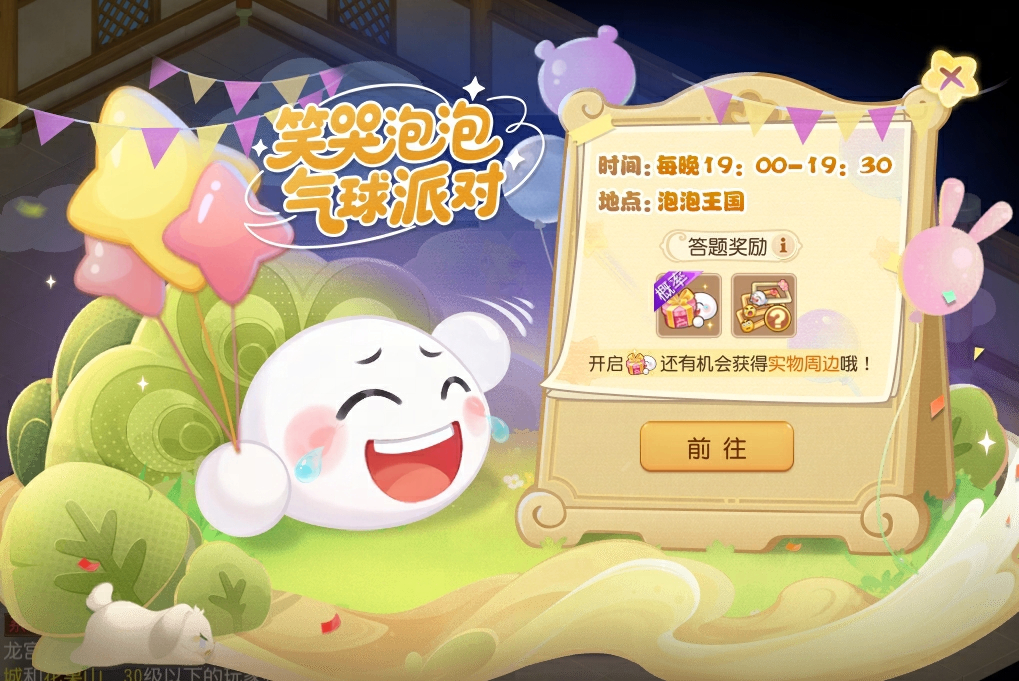 每晚来到泡泡家族的聚集地(新地图“泡泡王国一角”),参与笑哭泡泡的气球派对,答趣味表情题目,赢取精美实物周边及限时外观奖励!