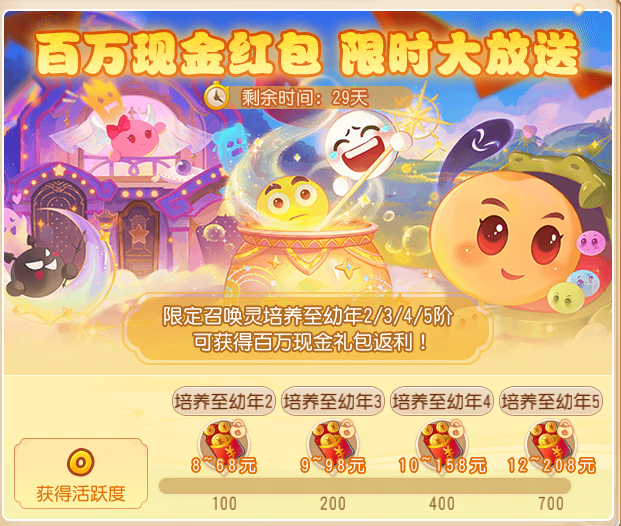在活动期间,满足特定条件的玩家购买任意限定召唤灵,可开启泡泡家族的返利活动,将限定召唤灵培养到特定阶段或购买对应成长礼,即可获得红包返利,至多累计返利532元!(返利活动资格数量有限,先到先得)