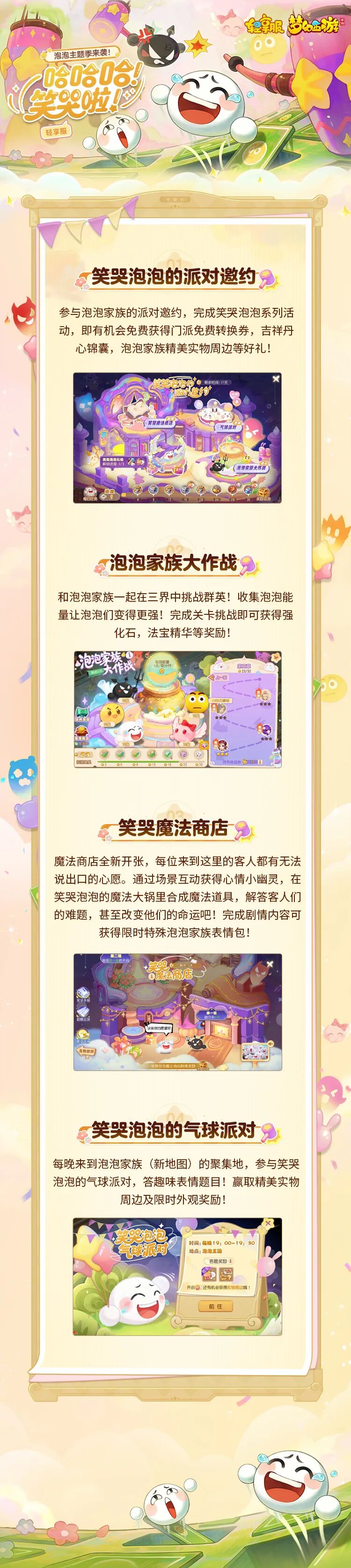 笑哭泡泡捣蛋入世,为三界带来欢声笑语。2025年11月19日12:00起,更有泡泡家族全体成员一起派对狂欢,邀你同乐!参与泡泡家族的派对邀约,完成笑哭泡泡系列活动,即有机会免费获得门派免费转换券,吉祥丹心锦囊,泡泡家族精美实物周边等好礼。少侠快来听听笑哭泡泡有什么笑话要说吧~