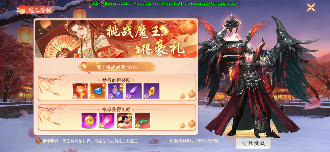 活动期间内,每日19:00时可对魔王进行挑战