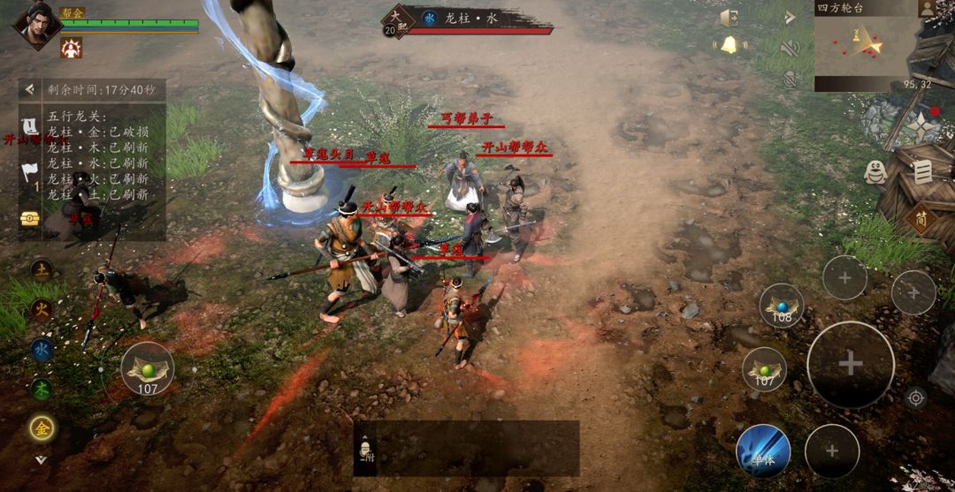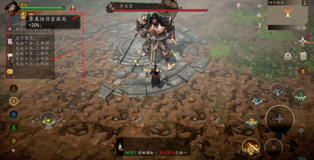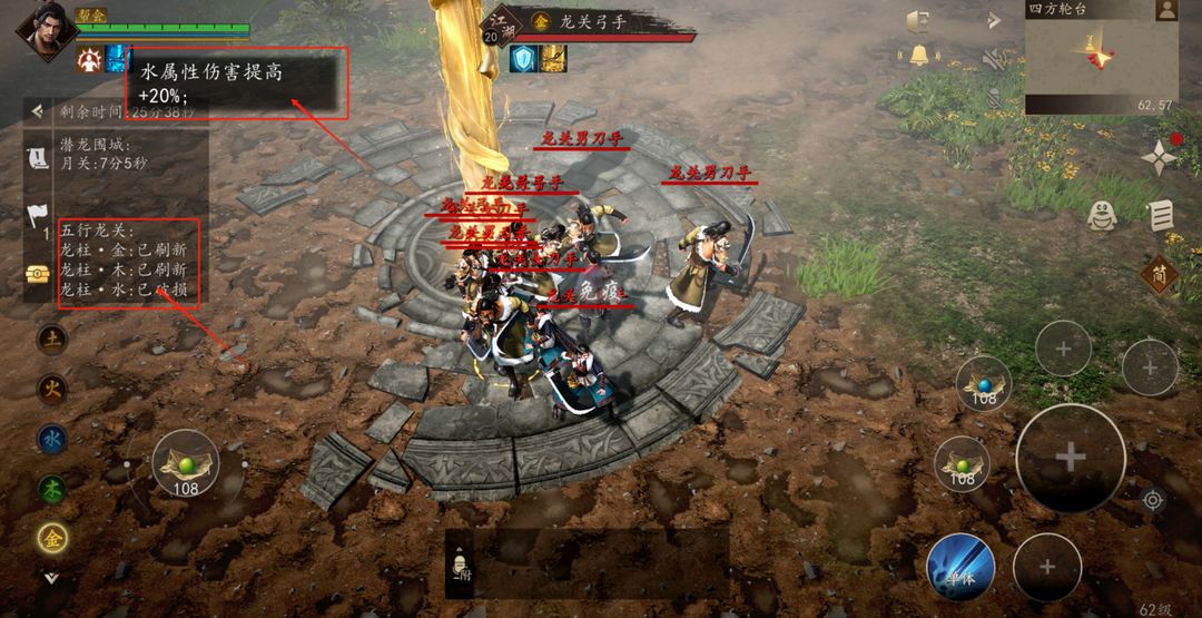 2、龙关怪物:每个区域会不断刷新龙关怪物(刷新间隔60S)并保护五行龙柱,不同龙关怪物附带不同的五行属性,击败龙关怪物才能摧毁龙柱