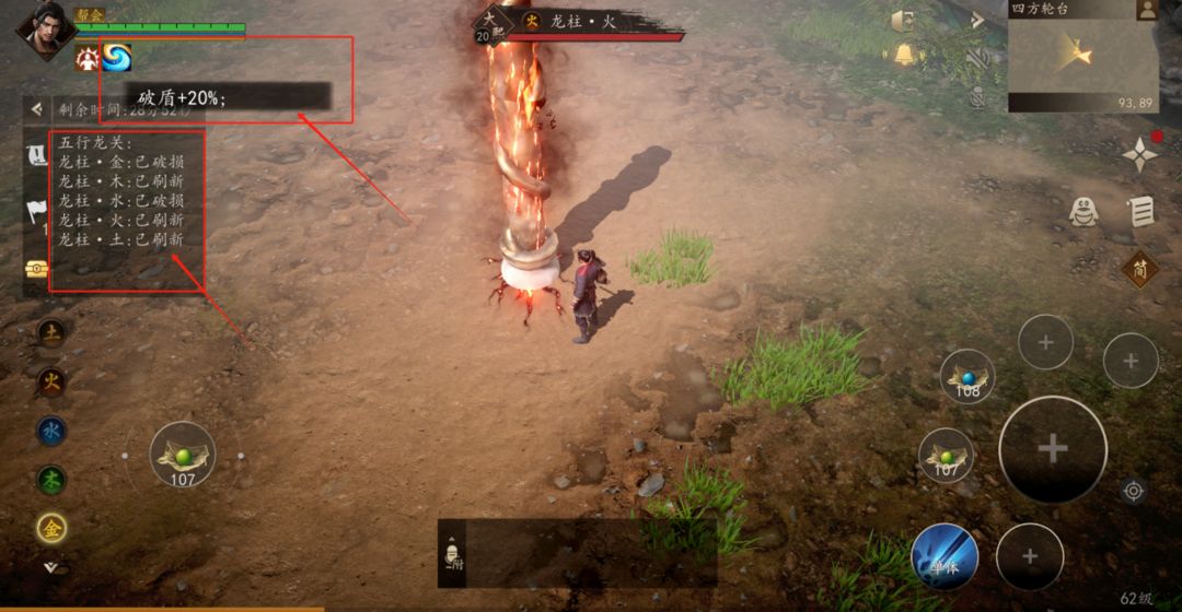 3、五行增益:摧毁龙柱可以获得对应的龙柱五行的增益效果,增益效果持续到五行龙柱修复完成。