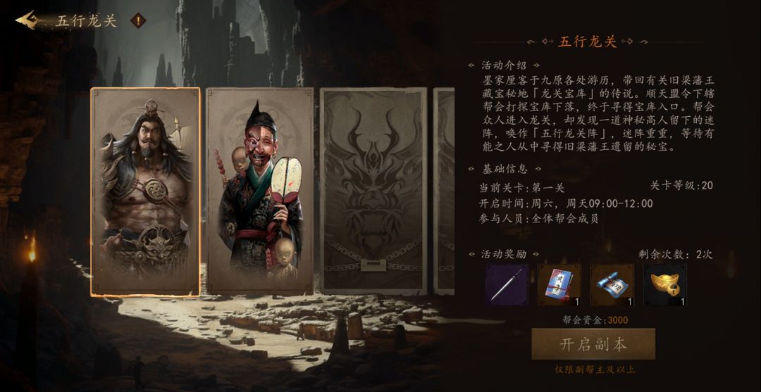 背景介绍:江湖传闻墨家厘客于九原各处游历,带回有关旧梁藩王藏宝秘地「龙关宝库」的传说。顺天盟令下辖帮会打探宝库下落,终于寻得宝库入口。帮会众人进入龙关,却发现一道神秘高人留下的迷阵,唤作「五行龙关阵」,迷阵重重,等待有能之人从中寻得旧梁藩王遗留的秘宝。