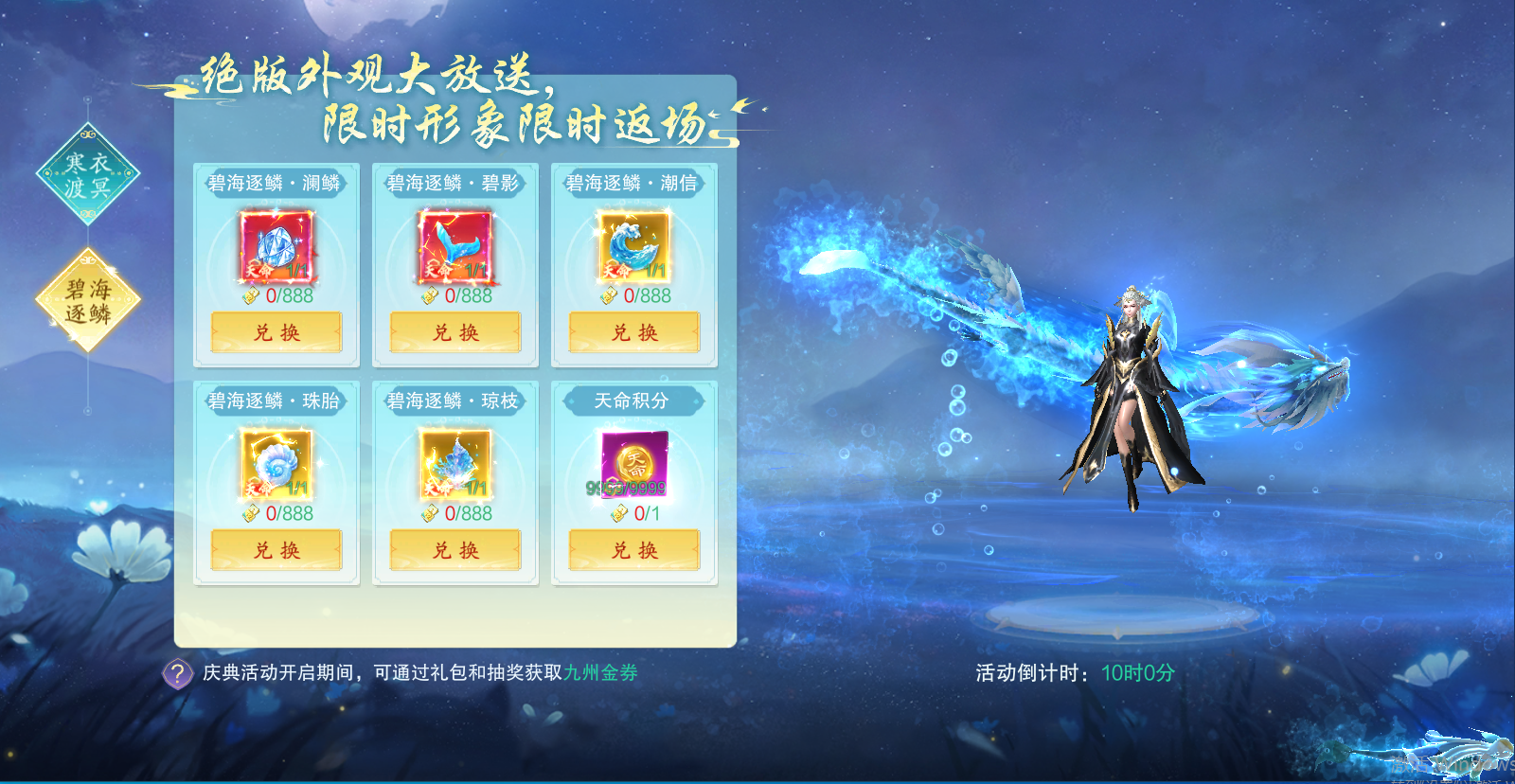 5、庆典外观:绝版外观大放松,分别是有寒衣渡冥和碧海逐鳞。不同的外观部位兑换需要不同的九州金券,九州金券的活动方式为通过礼包和抽奖