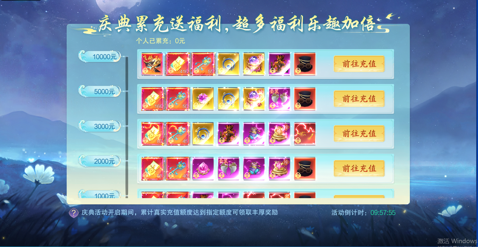 1、累充豪礼:累计充值仙玉活动,上限额度为9999。累充达到一定档位即可获得对应的道具奖励,例如法宝、战魂、羽翼和坐骑等。仙玉充值越多,能领取的奖励道具就越丰厚