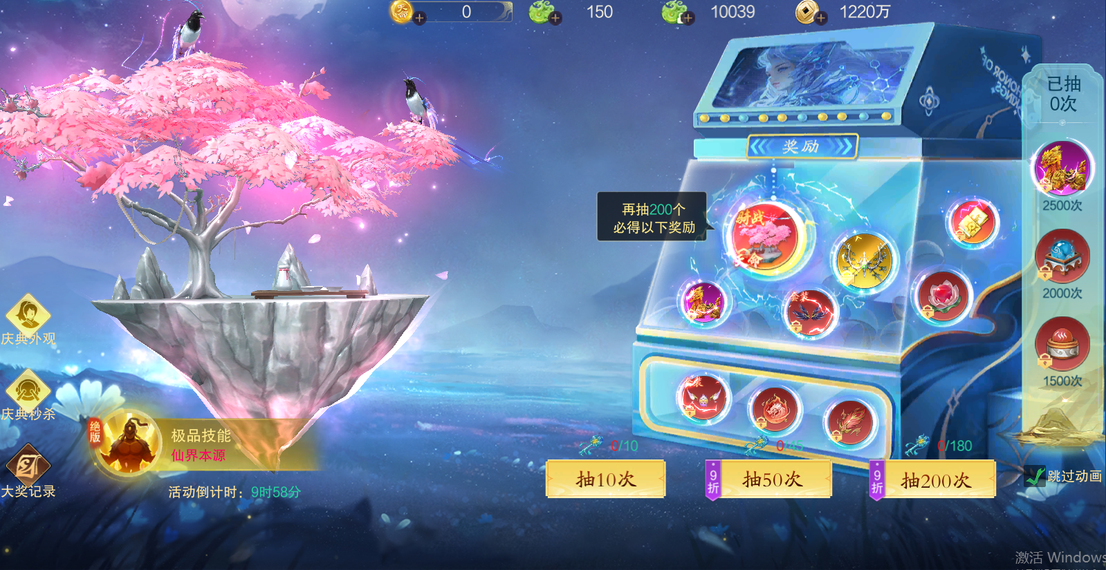 2、庆典狂欢:消耗弑神秘钥进行抽奖,保底75000出。可产出弑神装备自选、天降甘露(法宝)、寒冰之心(剑灵)以及本次主题活动的道奖励(保底次数最终会有一定的次数浮动)
