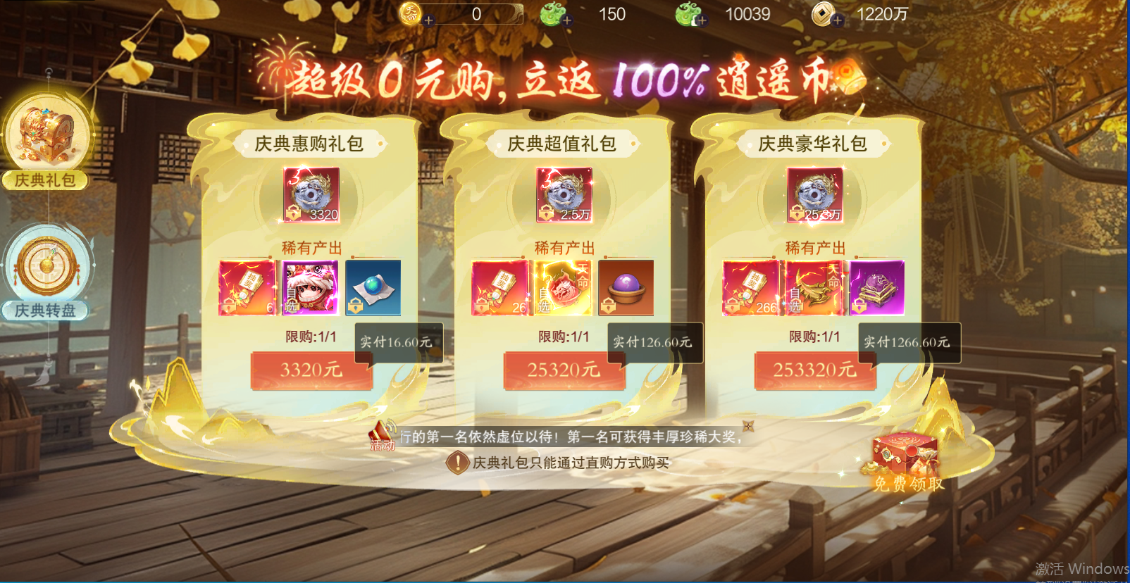 3、庆典礼包:购买庆典礼包获得逍遥币和庆典转盘的抽奖道具