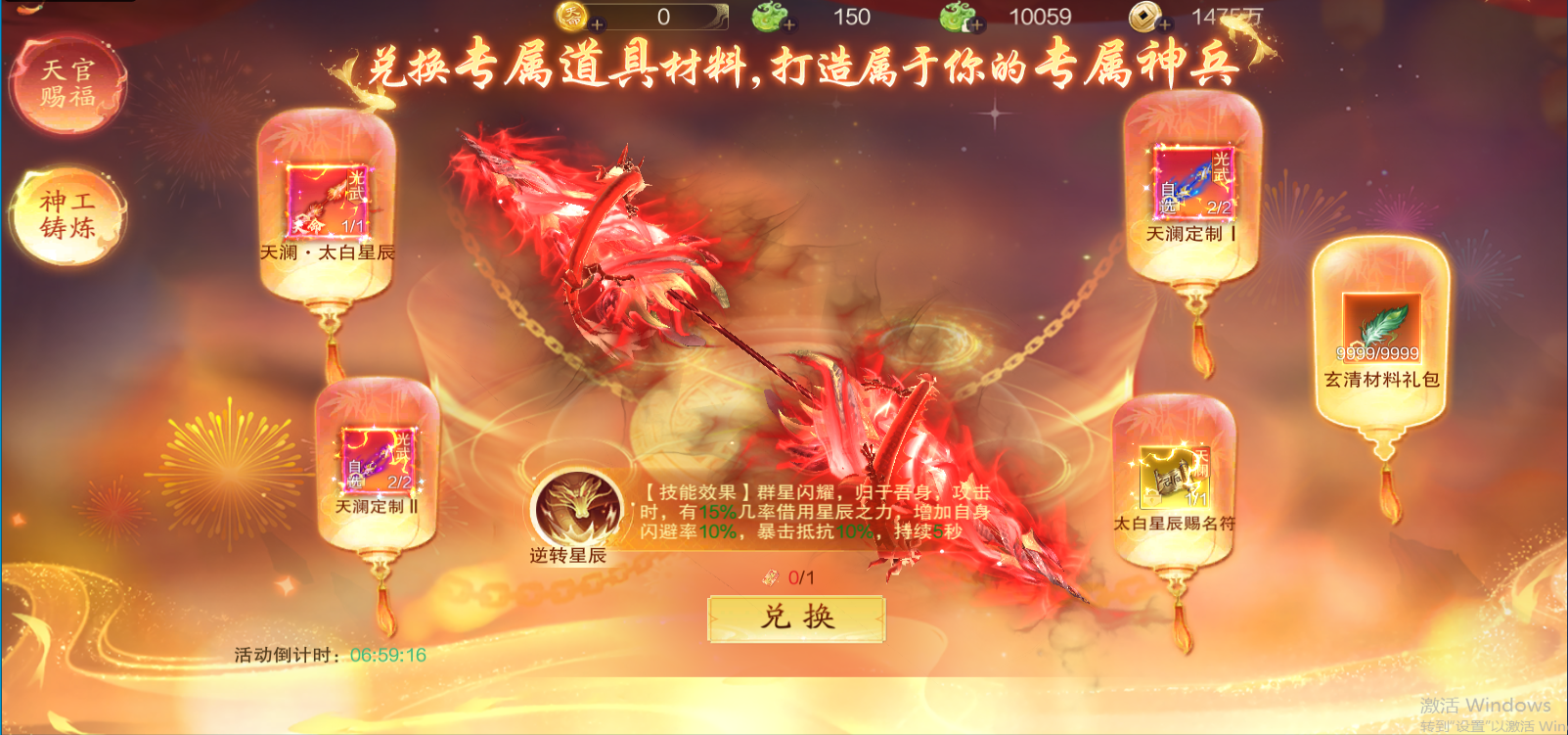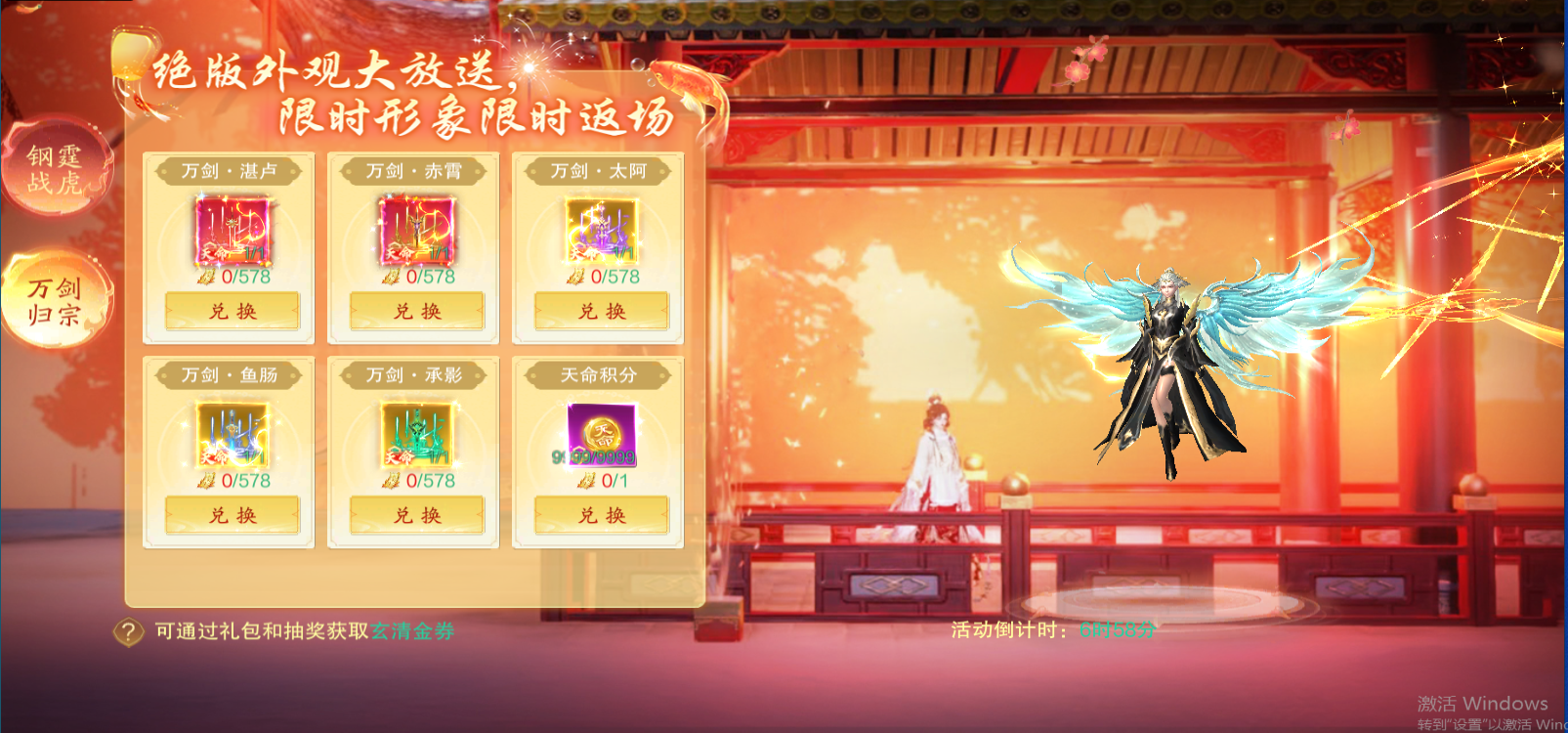 消耗活动道具进行抽奖,保底75000出。可产出百炼玄机(剑灵)、展翅萌卫(法宝)、魔魇光翼(羽翼)以及本次主题活动的道具奖励(保底次数最终会有一定的次数浮动)