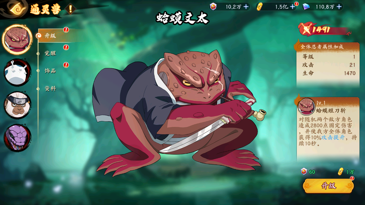 通灵兽可以通过布阵界面左下角编入队伍,不同的通灵兽拥有专属的加成效果,且升级通灵兽会为所有忍者提供属性加成。