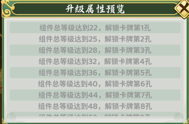 5. 每个单独组件每升级5级都可获得基础属性百分百加成,组件总等级达到22级后可开启卡牌孔