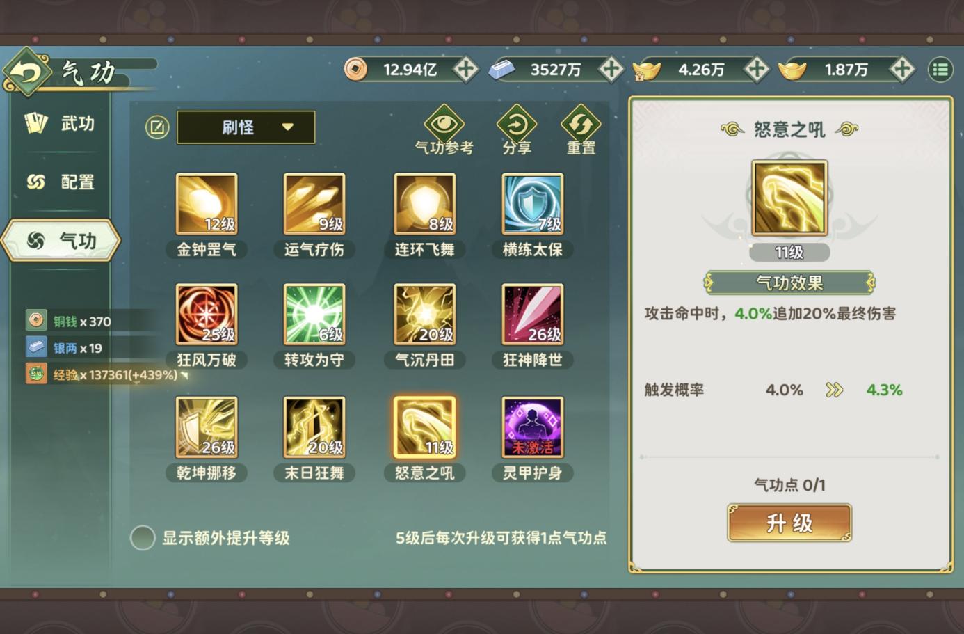 刷怪和打架气功配置其实差不多,唯一区别就是可以点点“金钟罡气”加点防御,站桩刷怪更稳。