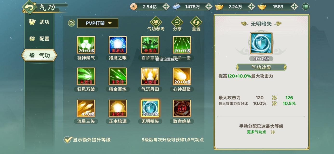 PVP打架,“无明暗矢”、“心神凝聚”必点,直接拉满。其次就是“凝神聚气”和“致命一击”,多余气功点给“流星三矢”,多余的给其他各加点都ok。