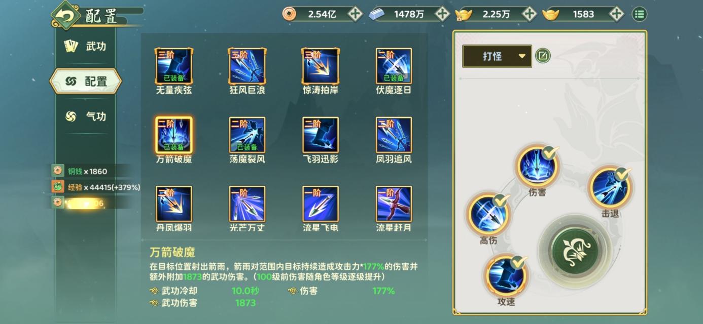 咱等级不够的,就选择“万箭破魔”,好用的不得了,站在安全区就能清完一波怪,大范围清怪效率超高。
