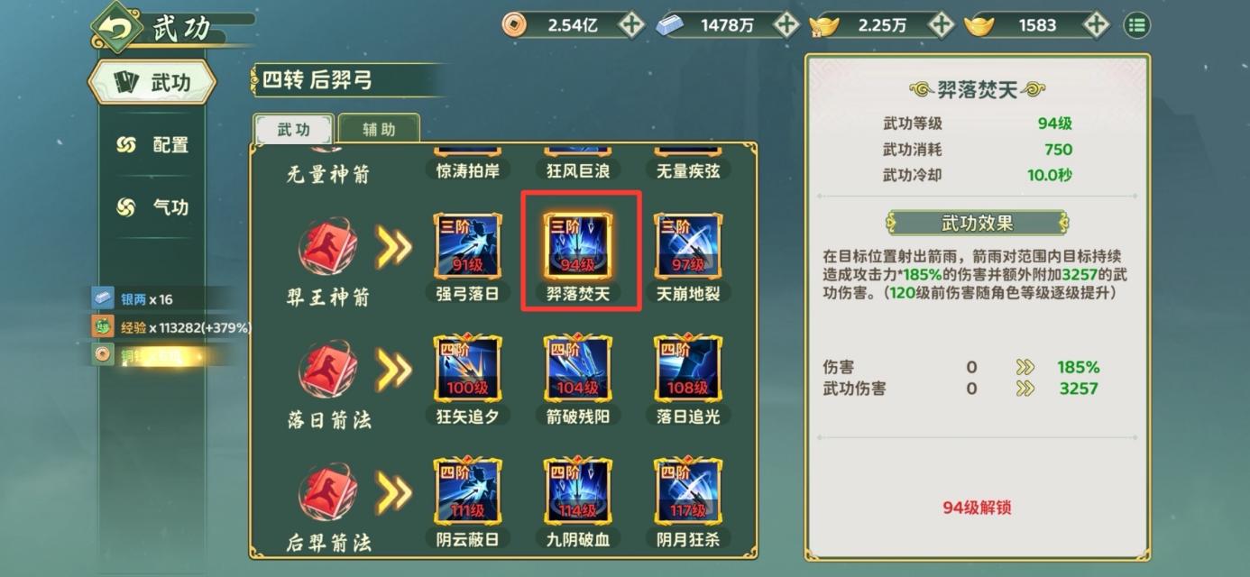 需要注意的是,【伤害】优选“九阴破血”/“羿落焚天”/“万箭破魔”系列,箭雨加额外附加的武功伤害,团战输出直接翻倍。