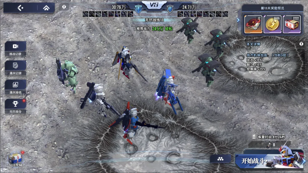 玩法【无尽战线】新增防卡关机制,每停留在同一关卡多一天,便可以在该玩法中获得一定程度的属性加成,直至通过该关卡。