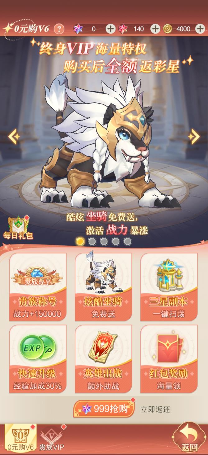 只需花费 999 彩星,即可直接解锁终身 VIP6专属特权,购买后花费的 999 彩星会立即全额返还至账户 —— 相当于白嫖 V6 所有福利 + 999 彩星,战力与资源双重丰收!