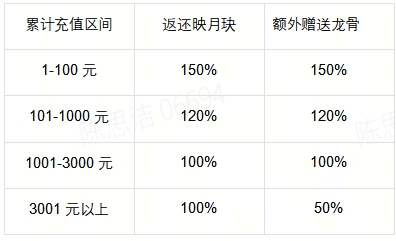 1元人民币=1映月玦,使用无门槛,可用于支付游戏中付费项目或兑换龙骨使用。