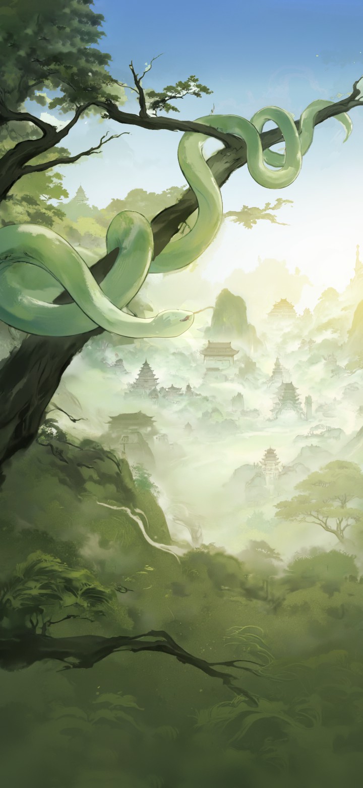 您再看这张图:青蛇盘踞于昆仑秘境,周身灵气澎湃,蛇瞳锐利如刀,千年修行的威压扑面而来。按说此等修为足以横行一方,可为何后续图景中她却狼狈不堪?难道这千年道行,竟在某次劫难中折损殆尽?