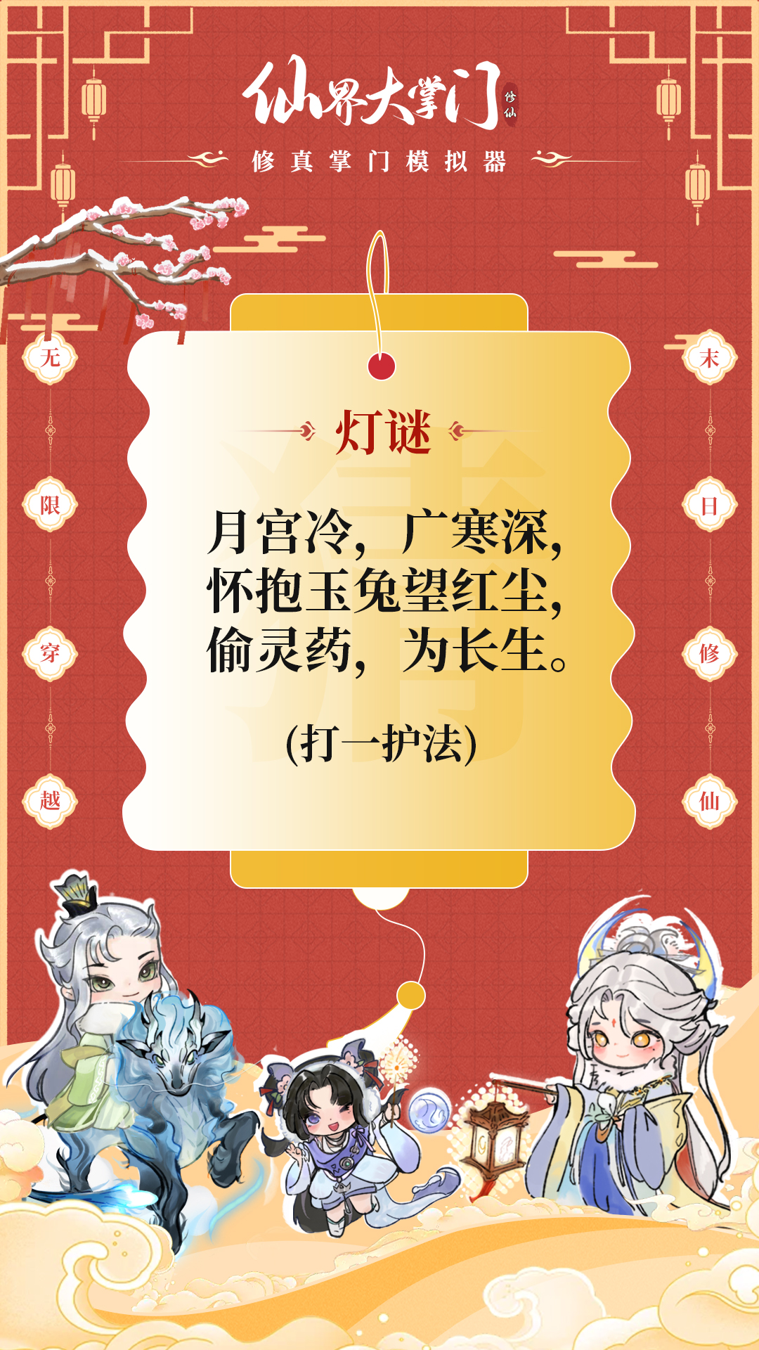 我宗最是潇洒不羁的护法剑逍遥,携八道趣味灯谜而来——自初八至十五,每日一道灯谜,邀您共乐。谜底皆藏于宗门轶事与护法传说之中,考考您是否心细如发、博闻强识~