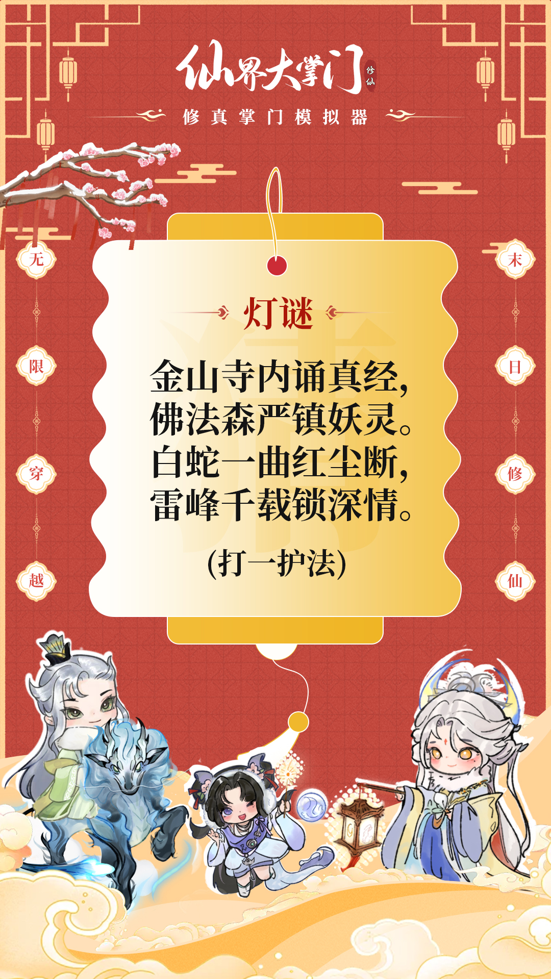 我宗最是潇洒不羁的护法剑逍遥,携八道趣味灯谜而来——自初八至十五,每日一道灯谜,邀您共乐。谜底皆藏于宗门轶事与护法传说之中,考考您是否心细如发、博闻强识~