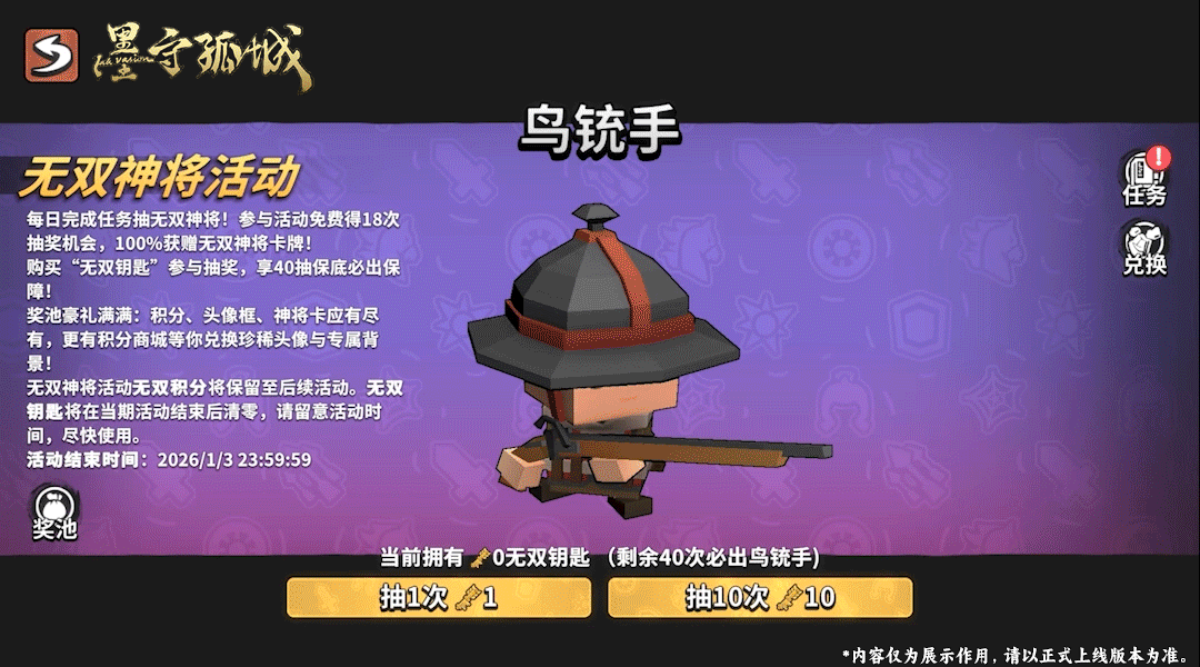 无双卡牌奖励为新卡牌-鸟铳手,青霜与红袖伞将作为卡牌奖励加入活动奖池,此外还新增一批新头像框。