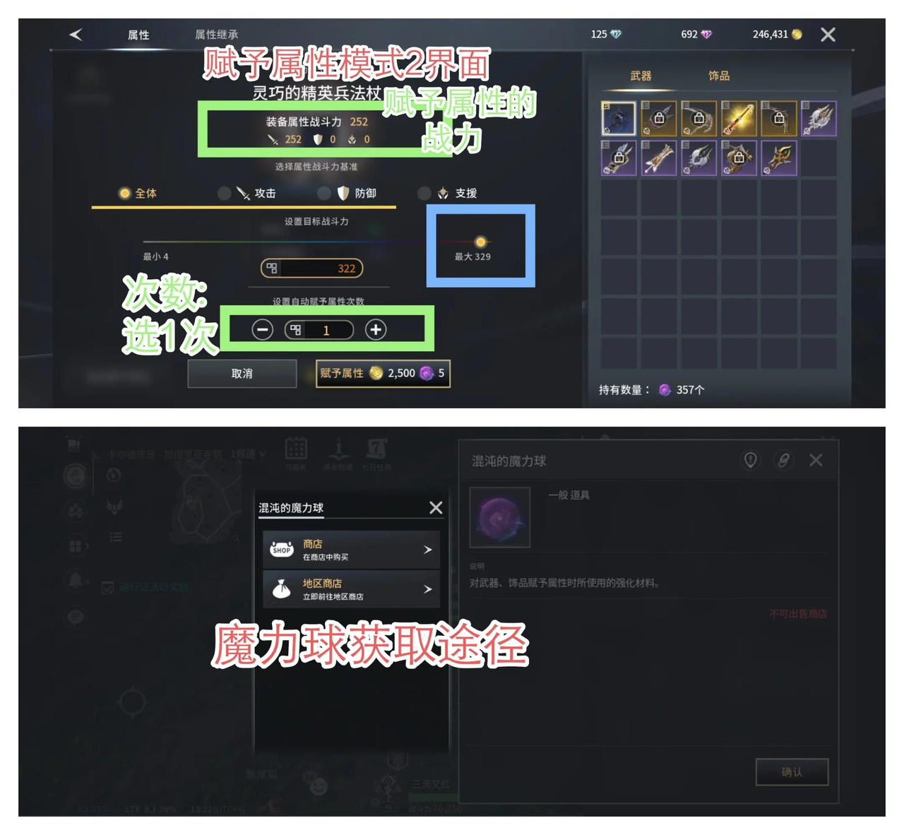 注:装备赋予属性需要消耗一定数量的魔力球,可以在商店购买或英雄商人那里对换少量魔力球。