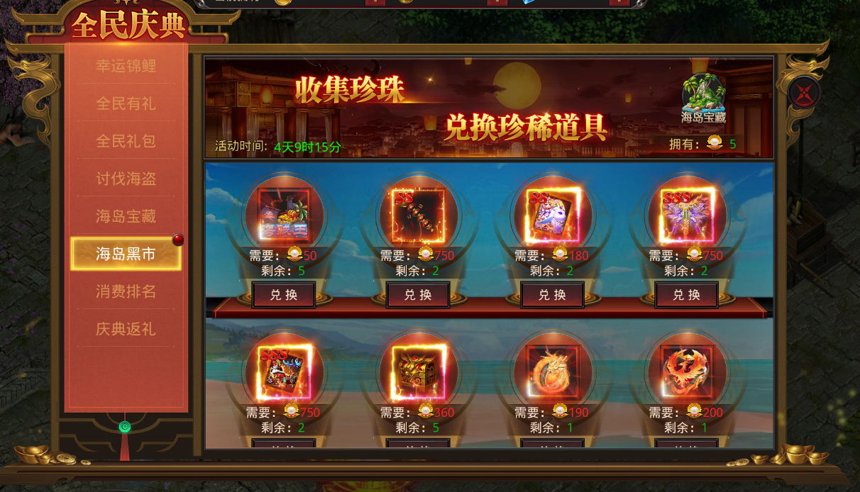 消耗珍珠道具兑换道具奖励,珍珠道具可通过“讨伐海盗”、“海岛宝藏”模块获
