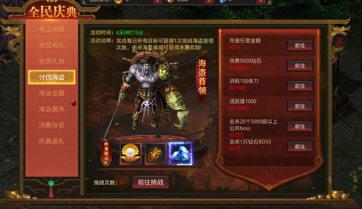 完成每日所有的任务目标,可获得1次挑战海盗首领的次数,击杀海盗首领掉落道具奖励