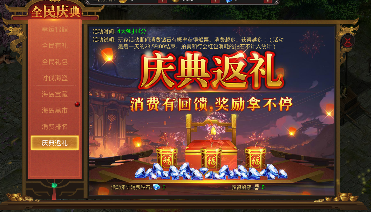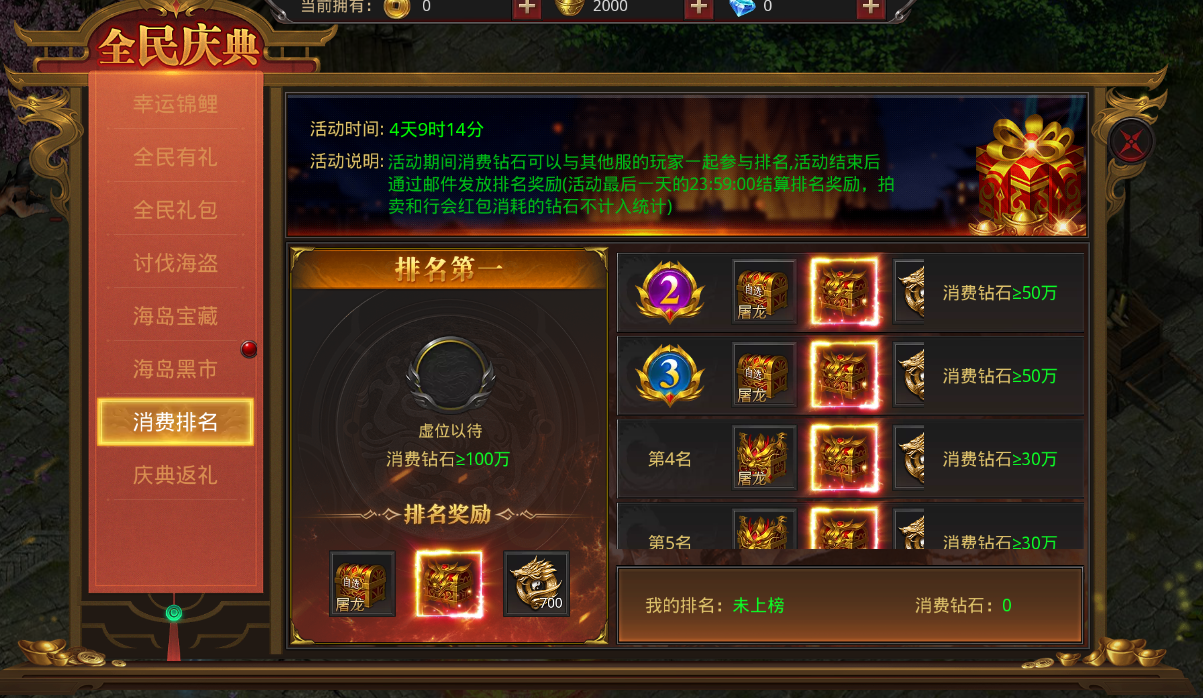 活动期间消费钻石进行排名,多个服务器玩家参与,按排名发放奖励