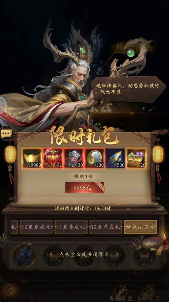 绝世法器限时礼包:完成主角-境界-入门·初境后会弹出,激活加16w战力,打架强,必买