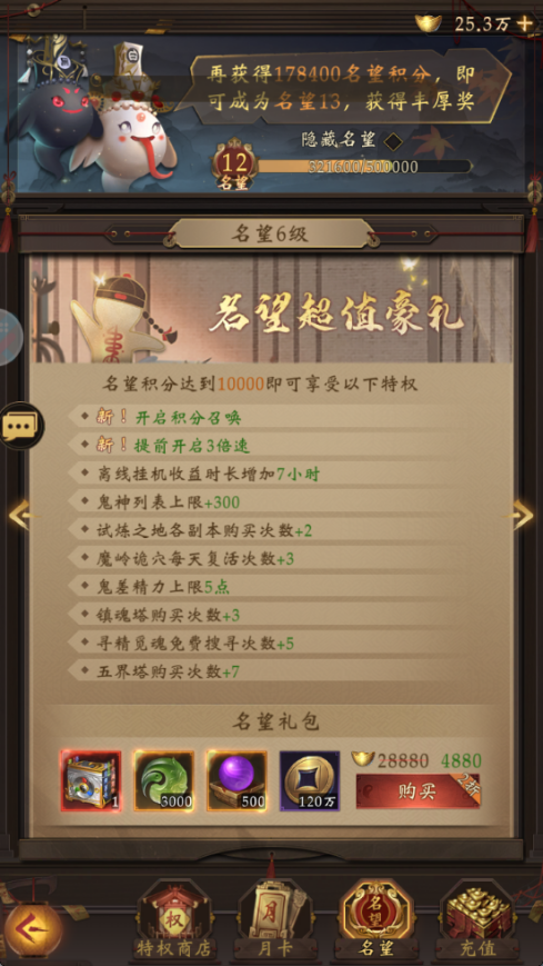 名望礼包:命望6-12都有神魔自选宝箱,仅需用元宝购买即可