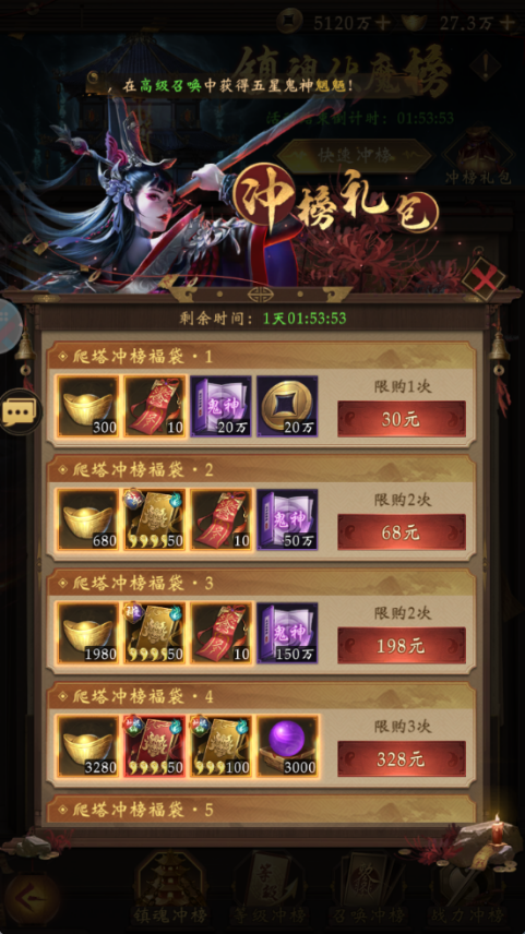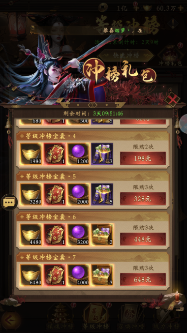 冲榜礼包-爬塔冲榜礼包:里面有三界自选宝箱+神魔自选宝箱,如果神魔跟三界不够用可以在这里购买