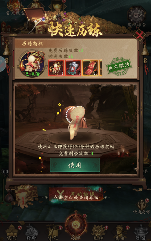 5.打开背包,有购买1元秒杀的背包有历练令牌,也不要全部吃完,卡级在吃1-2个,吃完接着打历练,以此类推,第一天45级轻轻松松