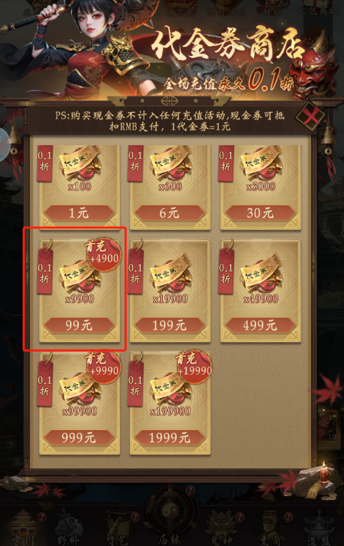 1.购买代金券:可以直接充值99元的代金券(额外送4900)去抵扣,相当于1.5倍充值