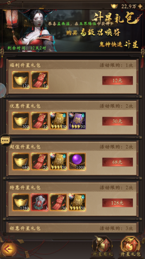 升星福利-升星礼包:里面有神魔自选宝箱+六星狗粮,价格仅低于新服限购礼包