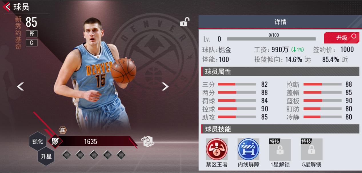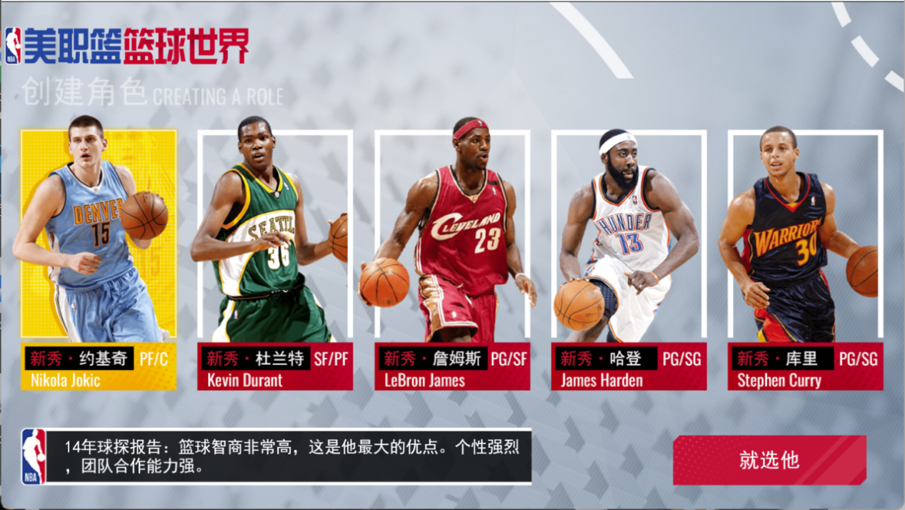 新秀介绍新秀-约基奇在百花齐放的NBA舞台上,这位来自塞尔维亚的中锋,被球迷亲切的称为“人类五花肉精华”的篮球天才尼古拉·约基奇于2014 年 NBA 选秀中于次轮第 41 顺位被丹佛掘金队选中。游戏中新秀“约老师”可担任球队的大前锋或中锋的位置。