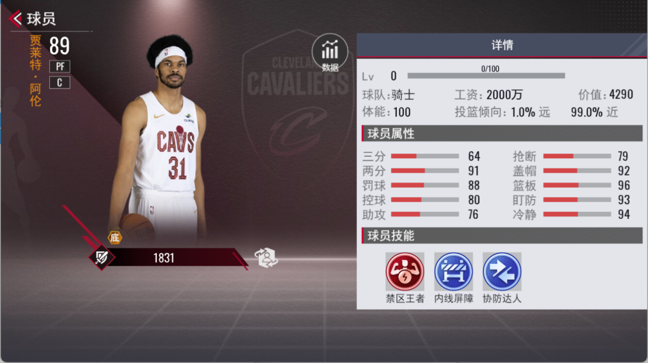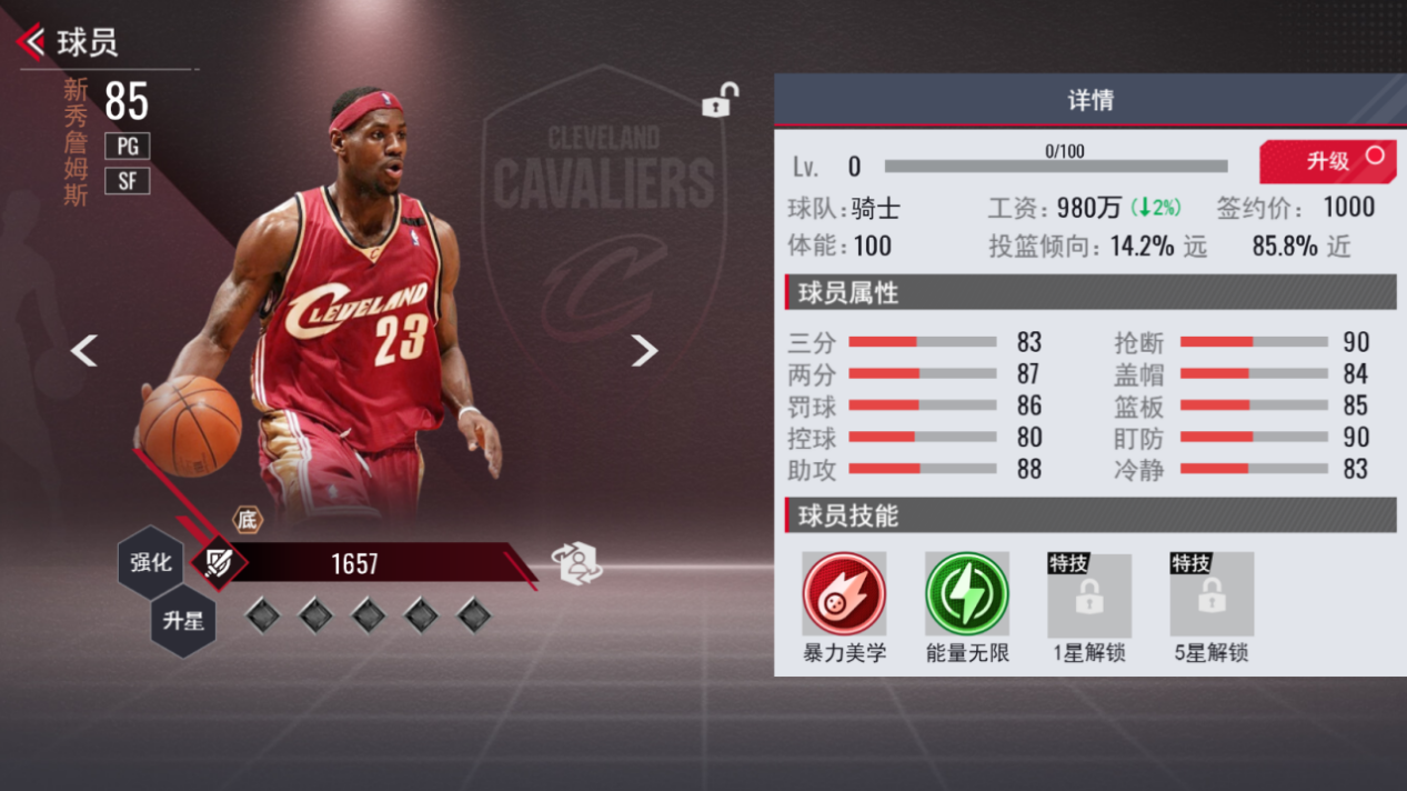 新秀-詹姆斯勒布朗詹姆斯出生于美国俄亥俄州阿克伦,在2003年以状元秀的身份被克利夫兰骑士队选中,4次总决赛MVP,“老骥伏枥,志在千里”,如今40岁的“詹皇”仍旧驰骋赛场,目前效力于洛杉矶湖人队。游戏中新秀詹姆斯可担任队伍中的控球后卫或小前锋。
