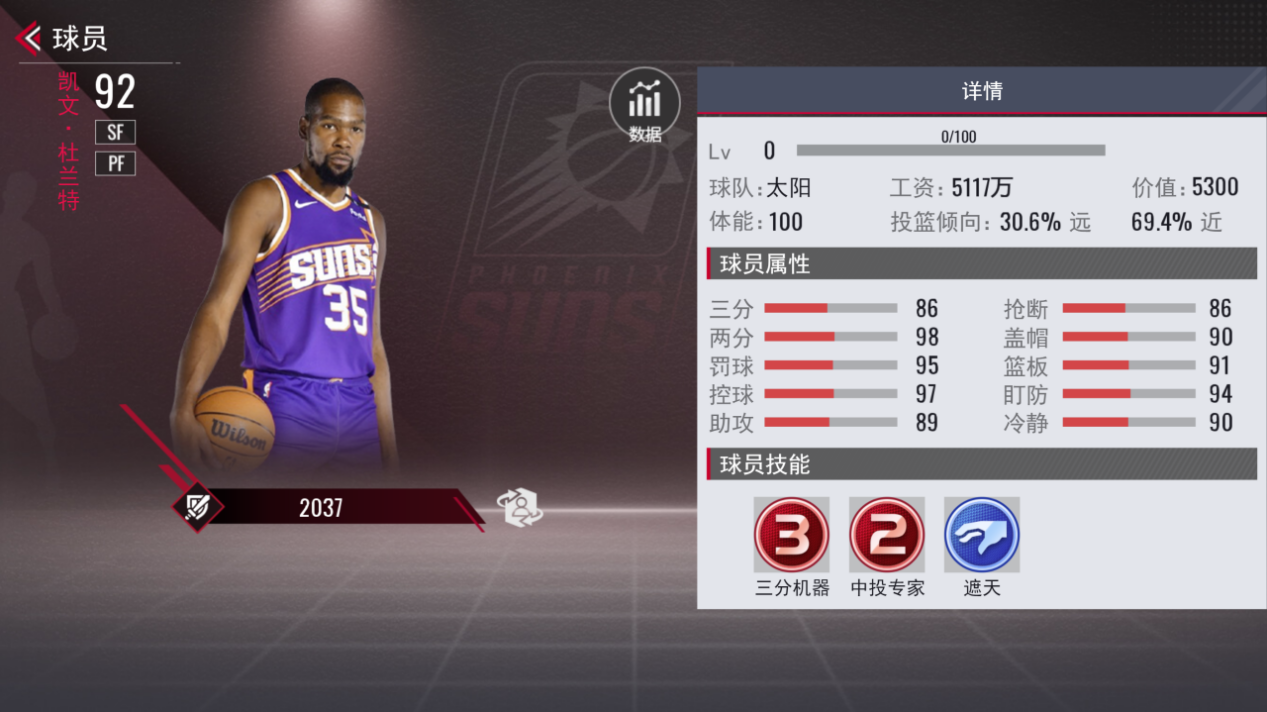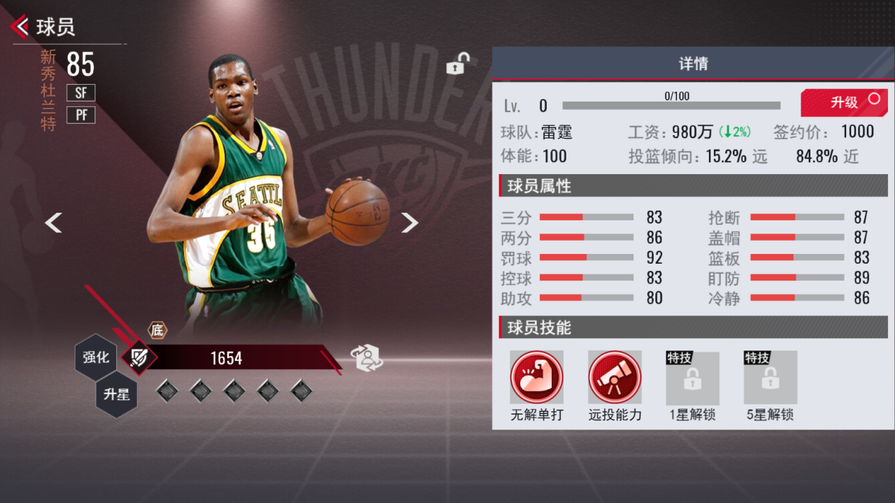 新秀-杜兰特凯文·杜兰特出生在美国华盛顿特区的一个普通家庭,在2007被西雅图超英速队(现俄克拉荷马城雷霆队)以第二顺位选中,及其卓越的个人能力很快在赛场上崭露头角。网友对这位超级明星有很多的调侃称呼,例如“死神”、“包工头”、“杜老二”等等。游戏中新秀杜兰特可担任队伍中小前锋或大前锋的角色。