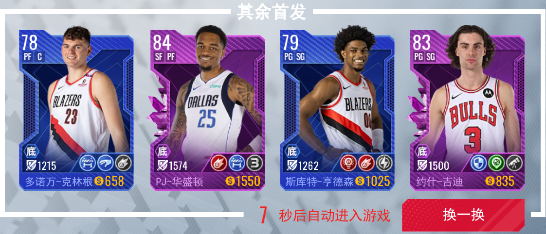 确认好新秀球员后,我们还需要选择另外4名首发球员。此时我们可以多点击下方的“换一批”,寻找一些工资低但战力高的球员来节省薪资空间。如下图中的约什-吉迪工资835能给1500战力,这就很不错。