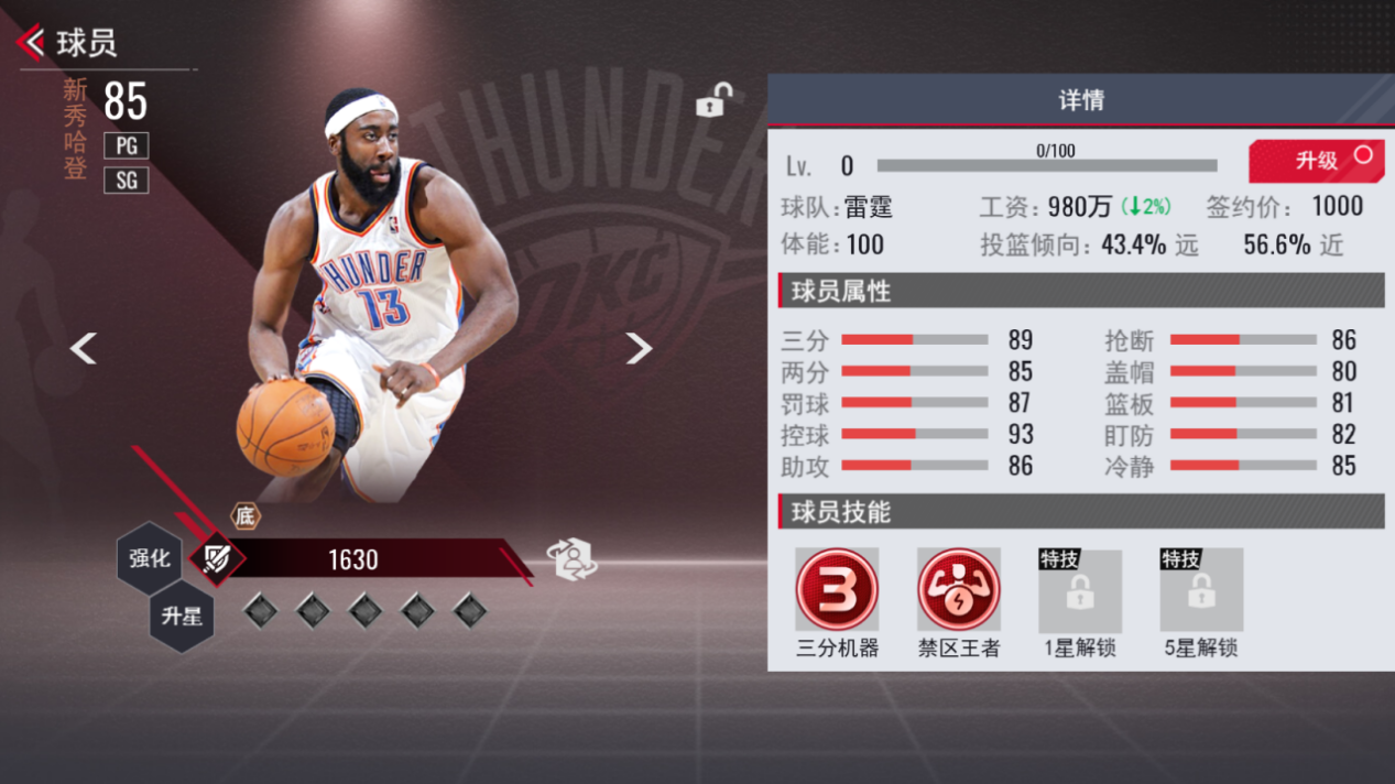 新秀-哈登这位来自加利福尼亚洛杉矶的“大胡子”在2009年被俄克拉荷马城雷霆队首轮第3顺位选中。出众的突破、投篮、传球意识,让这位新星在赛场上很快大放光彩,连续3个赛季获得NBA得分王(2018-2020),连续10个赛季入选NBA全明星阵容(2012-2022)。游戏中新秀哈登在队伍中可担任队伍的控球后卫或得分后卫。