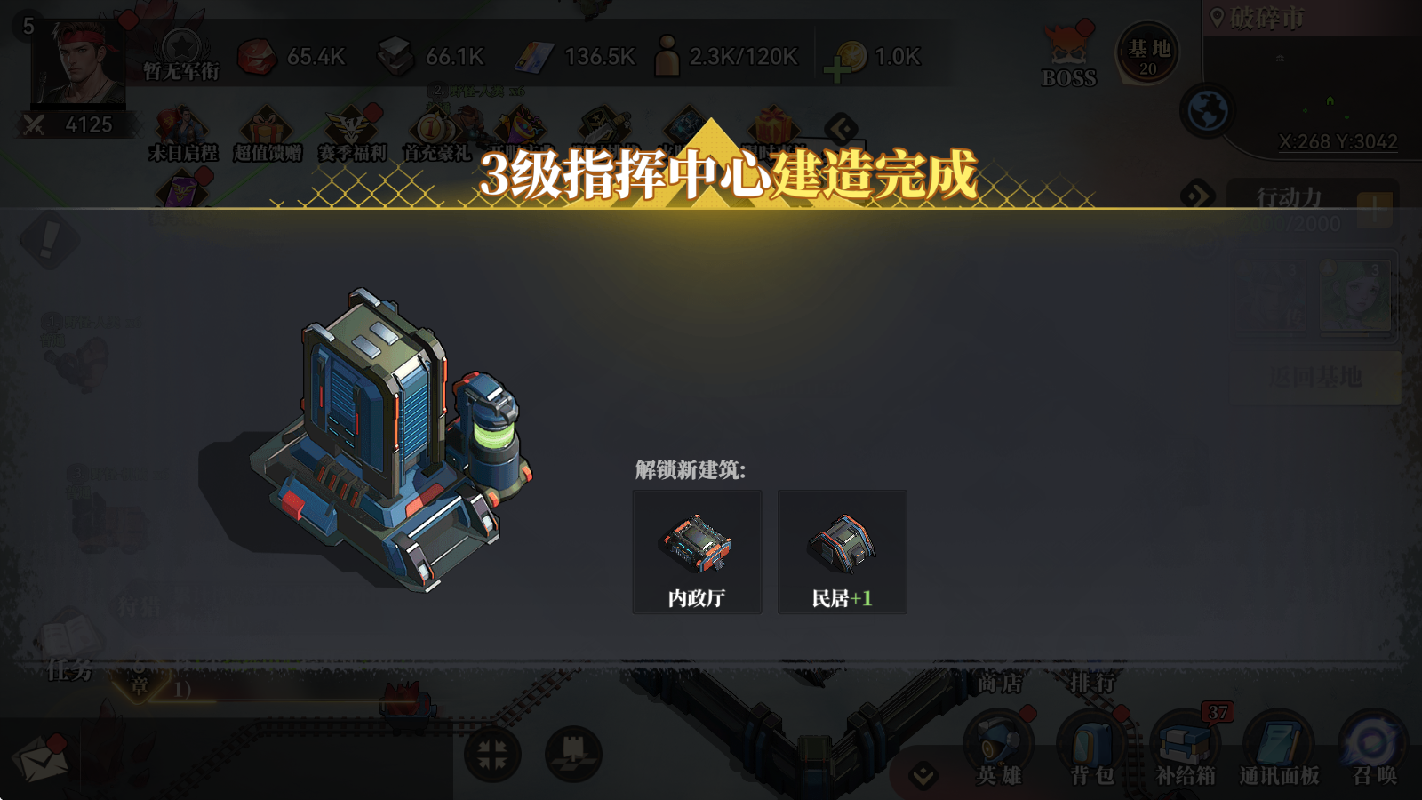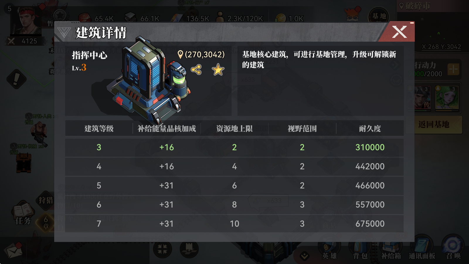 7.巧用新手保护机制:新手保护机制的时间为24小时(或指挥中心升到12级)在此期间优先发展基建和英雄战力,积蓄足够的战力和基础物资后发展防御工事性价比更高。