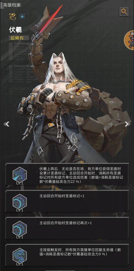 被动蓄力(场下生效):只要伏羲在阵容中,每当友方单位获得圣盾时,便会为他累积1层标记。此效果在他上场前即可持续触发。