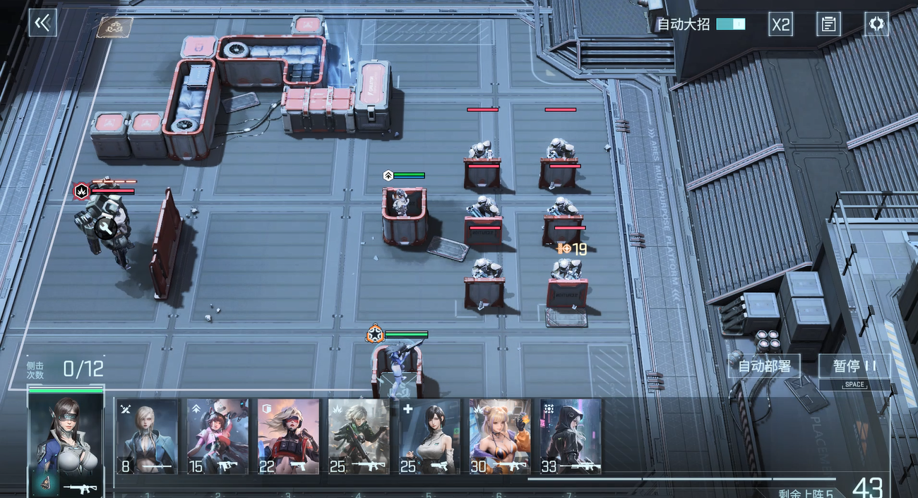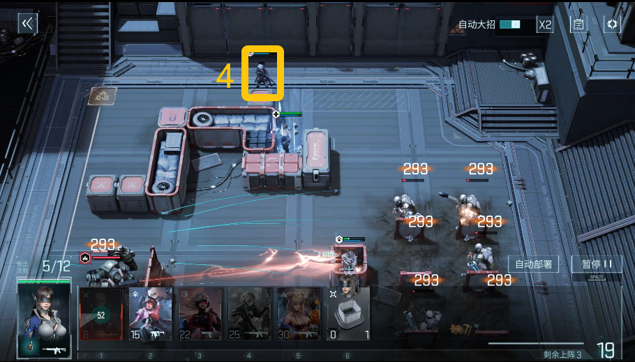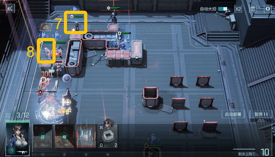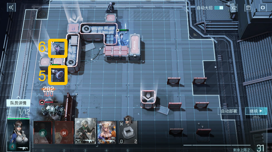按照图示依次上阵【赛卡卡】(1)、【芮尼】(2),赛卡卡在掩体内负责扛伤&输出伤害,芮尼在增益位置,可以持续加血,保障赛卡卡存活的更久