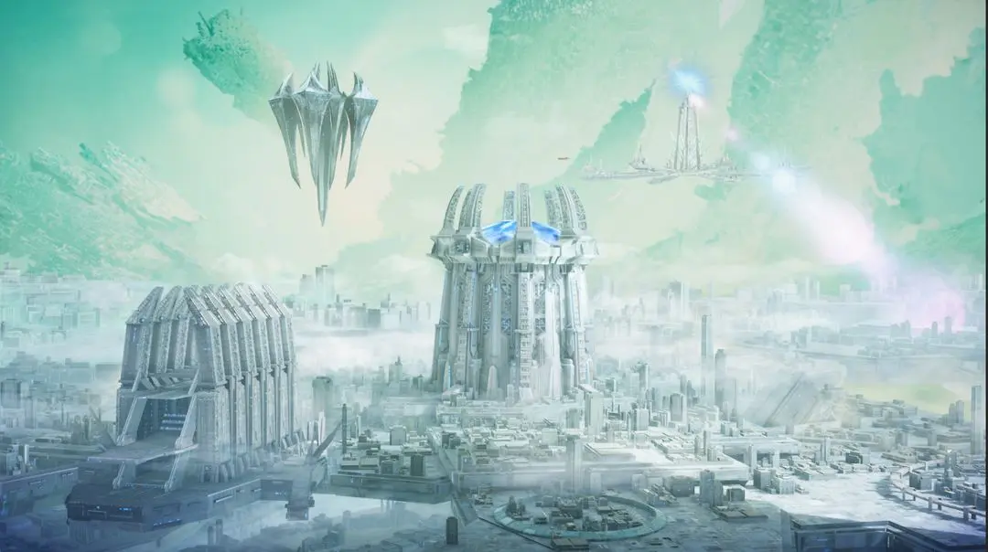 那么,如此神圣的故乡,在我们的游戏世界里又会怎样呈现呢?当你踏入游戏中的光之国,第一眼就会被那“神圣科幻”的氛围深深吸引——悬浮在天际的棱晶建筑如同神迹般舒展,折射着清透的荧光。城市核心的巨塔以精密的机械纹理和弧面穹顶构筑,冷峻中透出无可比拟的威严,仿佛宇宙和平的中枢正在这里默默运转。